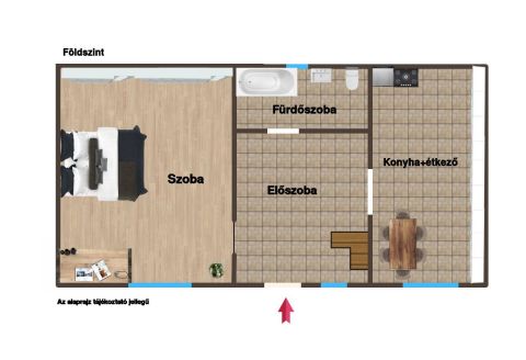 alsó szinten: tágas előtér, konyha, fürdőszoba, külön nyíló szoba