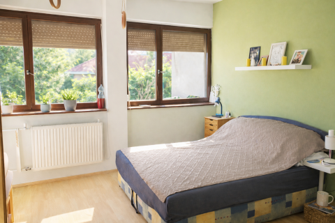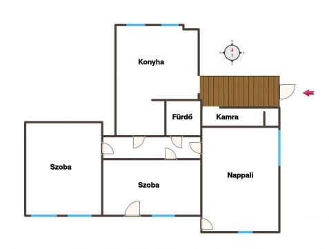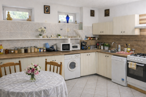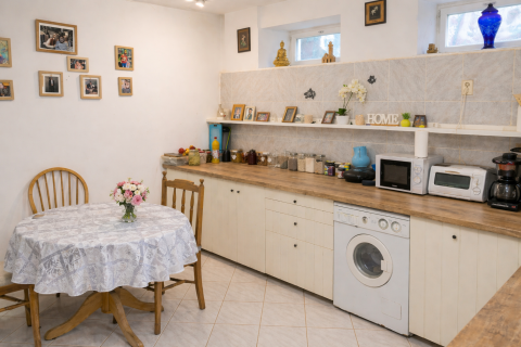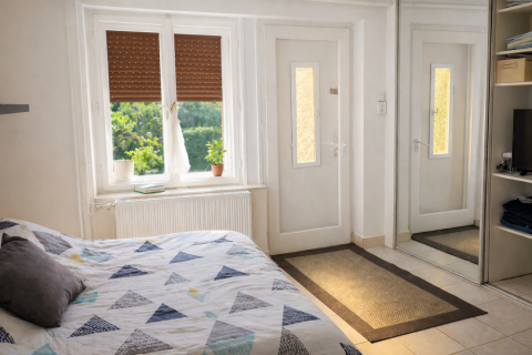 Az ingatlan elosztása rendkívül funkcionális: a két különnyíló hálószoba és a napfényes nappali mellett egy konyha, egy fürdőszoba és egy praktikus kamra biztosítja a kényelmet. A lakás igazi különlegessége a határok elmosódása kint és bent között: több helyiségből is közvetlen kijárás nyílik a kertbe, így a természet szinte beáramlik a belső terekbe.